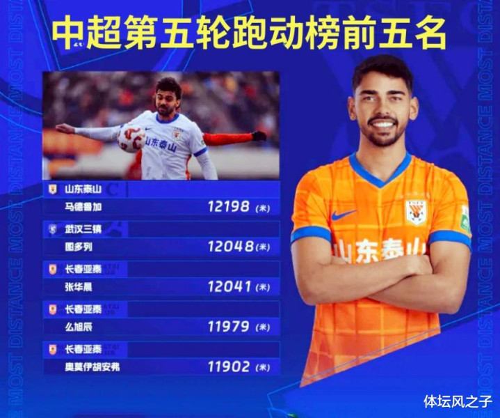 最近,官方公布的一项数据引发了泰山球迷的格外关注,在第五轮的跑动距离的榜单中,来自泰山队的中场外援以12198米的跑动距离高居榜首,成为了本轮的跑动王,另外,来自武汉三镇的外援图多列以12048米排在第二位,而在前五名中,剩下的三人全部来自长春亚泰,其中张华晨12041米排在第三位,么旭辰11979米排名第四,奥莫伊胡安弗11902米排在第五。